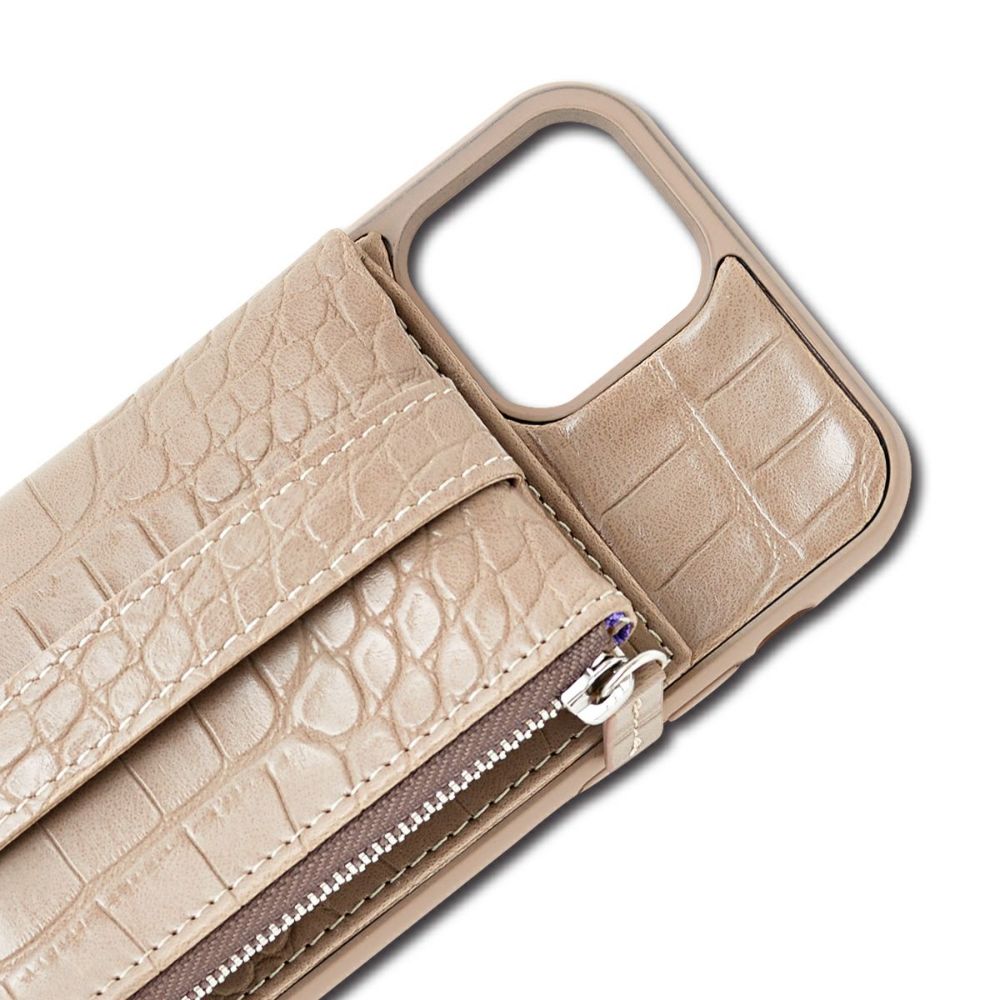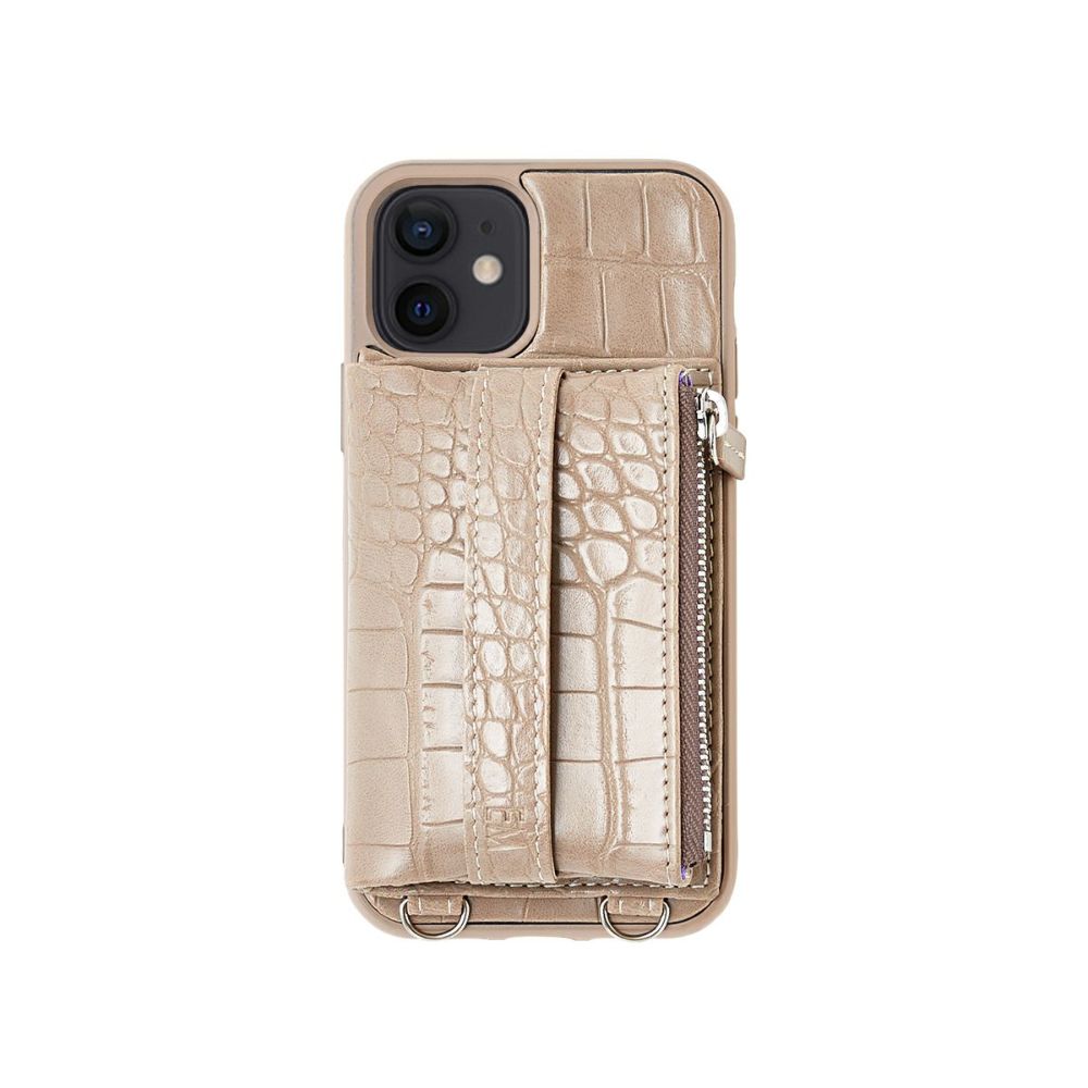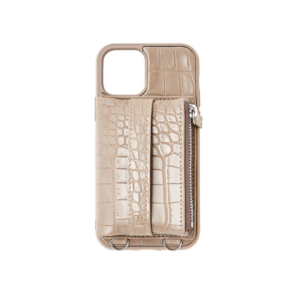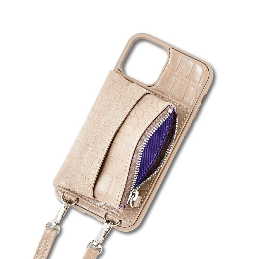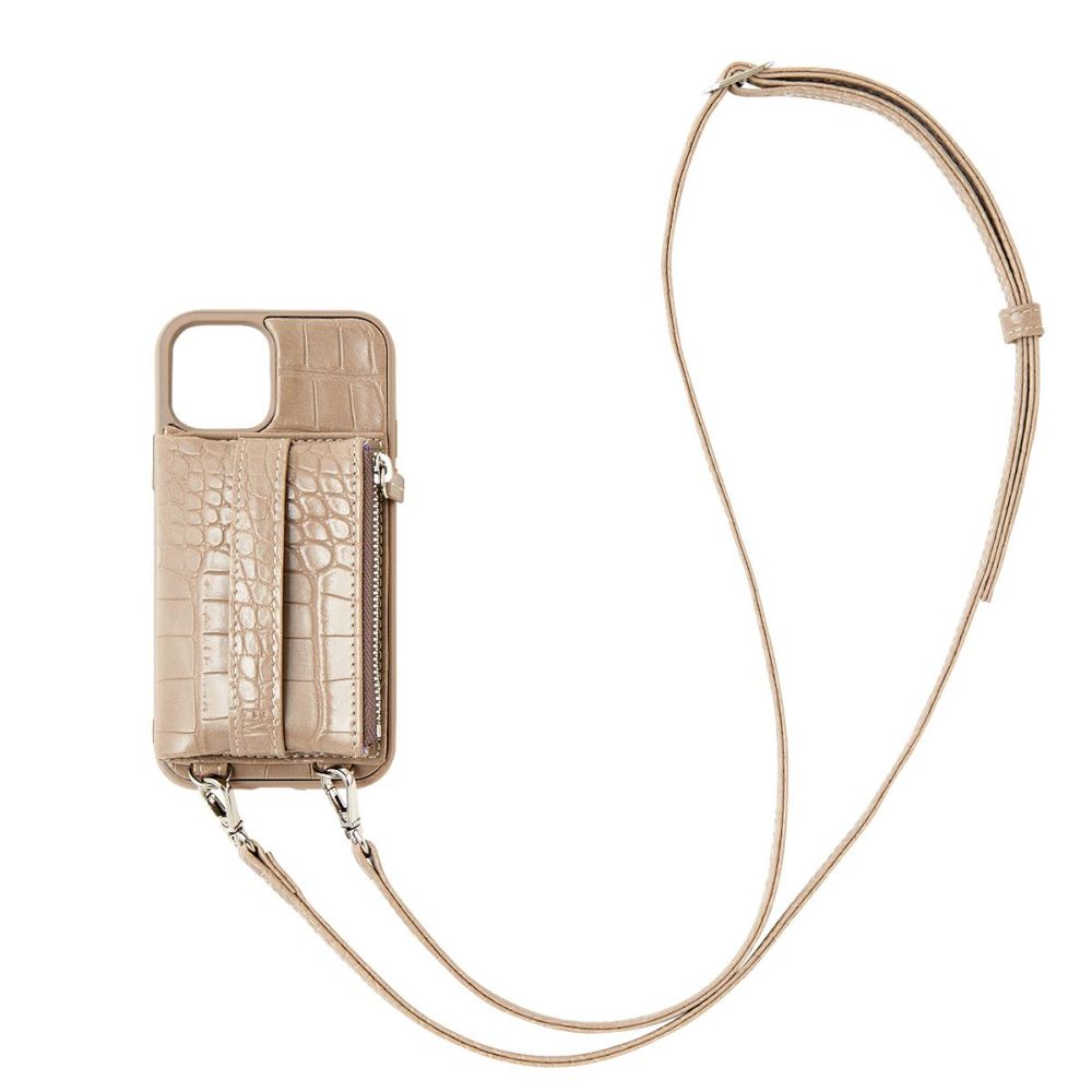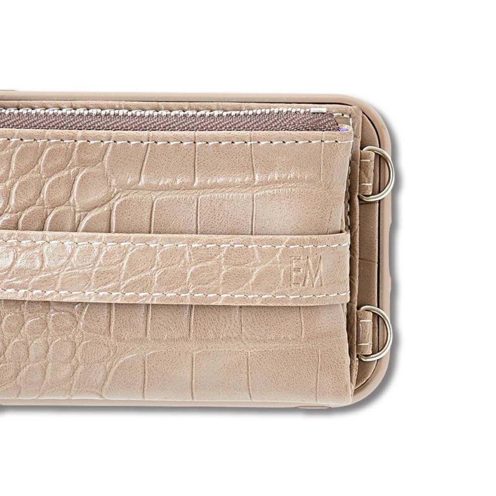 EMオリジナルデザインのスマートフォンケース。フェイクレザーのクロコダイル柄を型押しした、EMで人気の素材を使用しました。コインケースやカードポケットを備えているので小銭やICカードを収納することができます。横向きに自立出来る仕様にもなっているので、動画を見るときにも便利です。付属のショルダーベルトを装着し、ミニバッグの様にご使用頂けます。