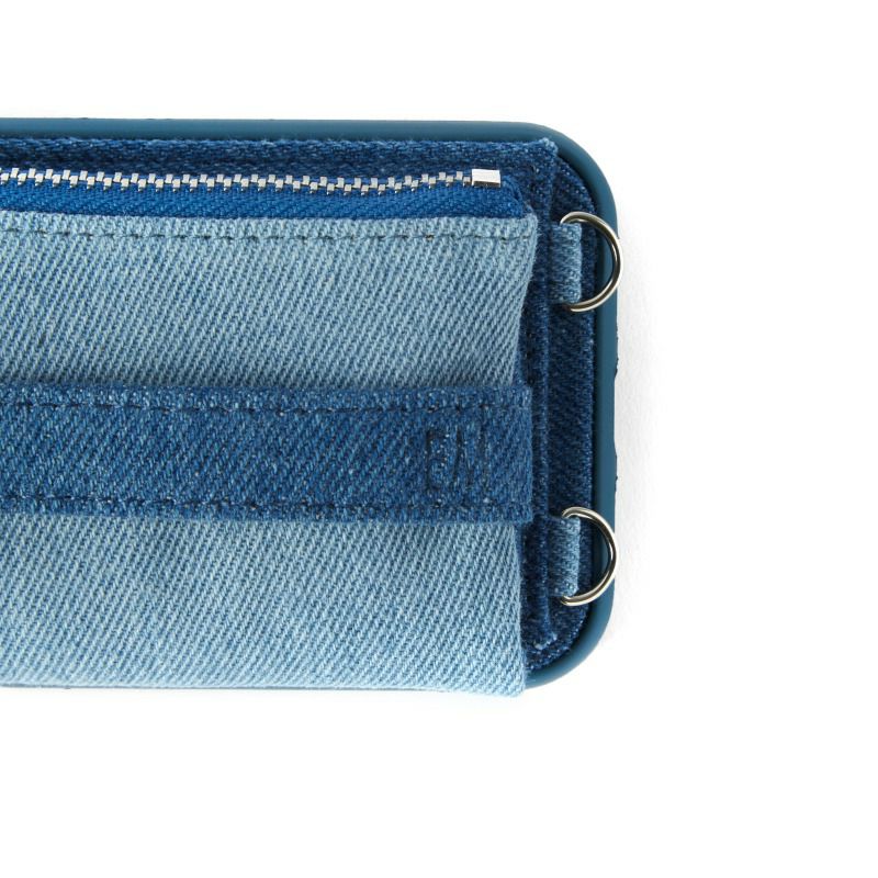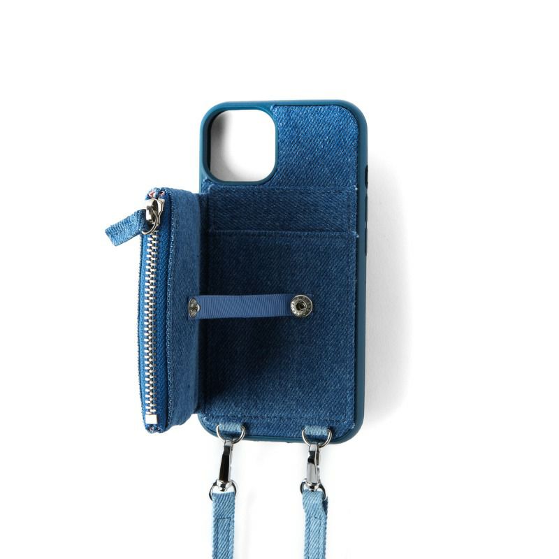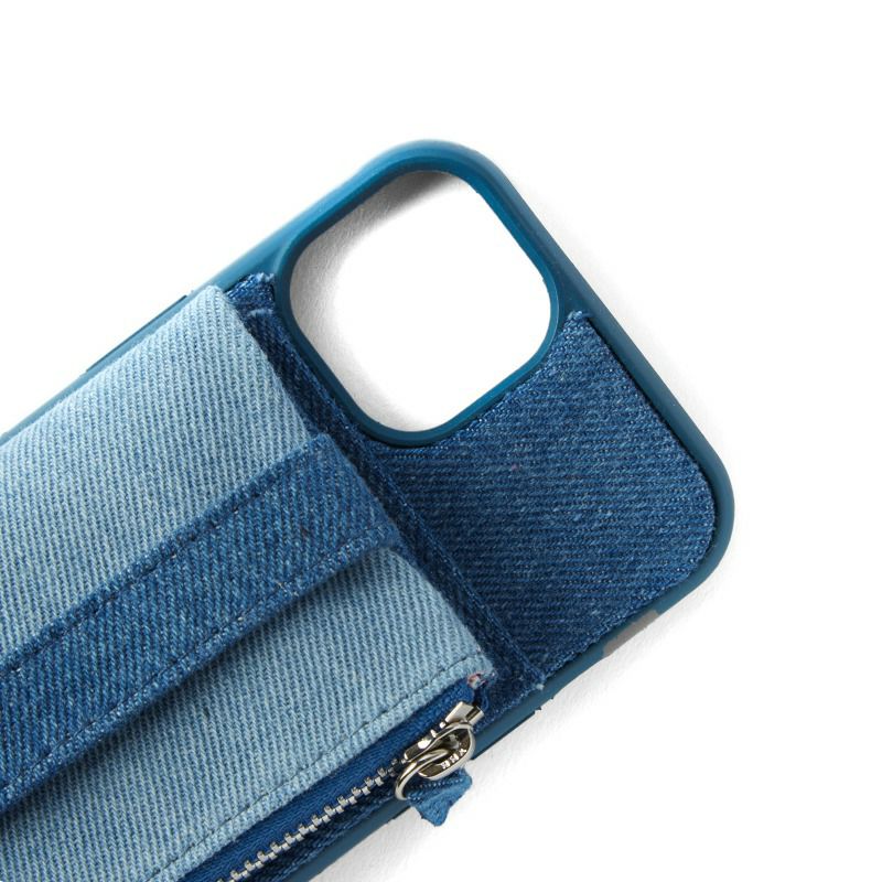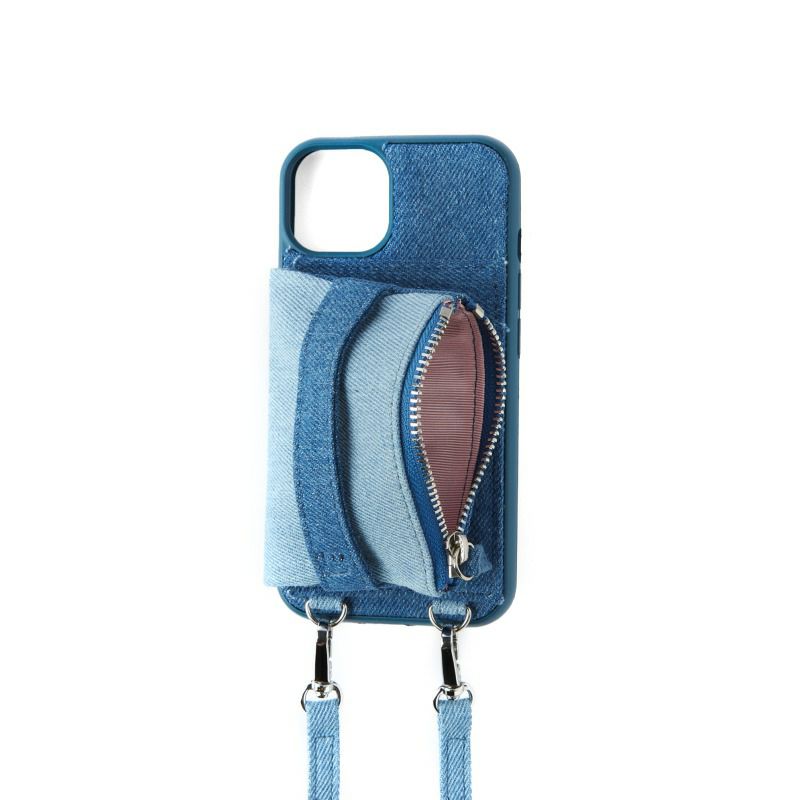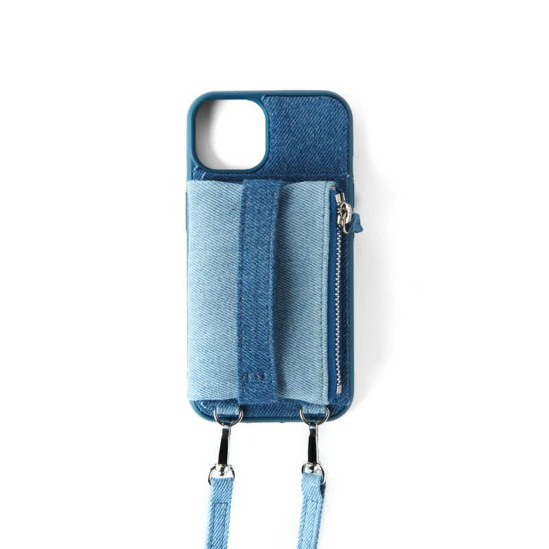 EMオリジナルデザインのスマートフォンケース。デニム素材を2色使用しました。コインケースやカードポケットを備えているので小銭やICカードを収納することができます。横向きに自立出来る仕様にもなっているので、動画を見るときにも便利です。付属のショルダーベルトを装着し、ミニバッグの様にご使用頂けます。