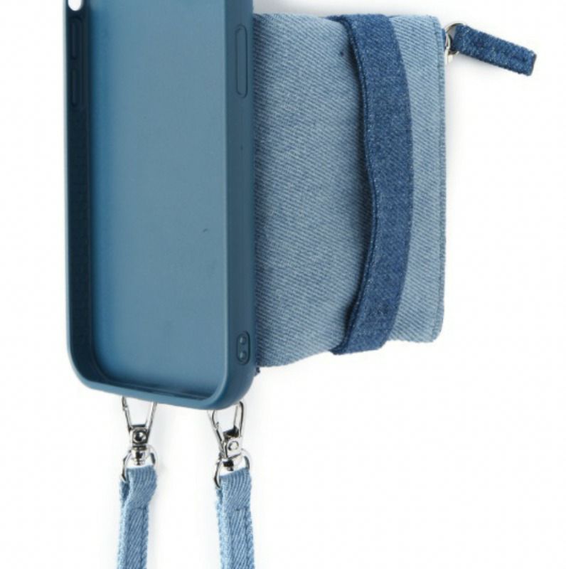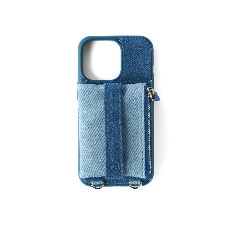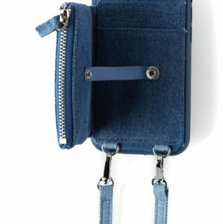 EMオリジナルデザインのスマートフォンケース。デニム素材を2色使用しました。コインケースやカードポケットを備えているので小銭やICカードを収納することができます。横向きに自立出来る仕様にもなっているので、動画を見るときにも便利です。付属のショルダーベルトを装着し、ミニバッグの様にご使用頂けます。